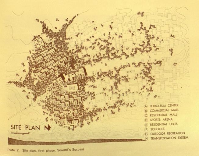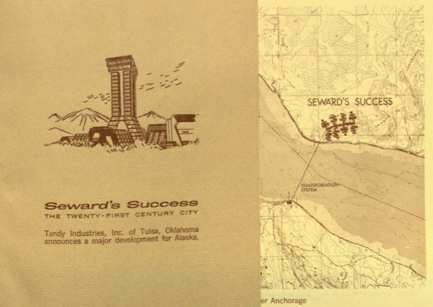 In 1962, Tandy Industries of Tulsa, Oklahoma proposed the construction of a new city in Alaska, the first 21st century city to ever be built. It was to be a completely domed city, with no cars, and huge public malls. Inside, 70,000 people would live in state-of-the-art apartments springing from exquisite architectural forms. Inside the city dome it would always be 62 degrees, avocadoes and mangos could be grown in the terraformed ground below. It would be accessible via a climate-controlled sky tram from downtown Anchorage, or by water taxi across the Knik Arm. The name of the town was to be Seward's Success. It would be the epicenter of the new oil industry in Alaska, as billions of barrels of oil were exhumed from the North Slope. This was the original destination of Alaska's first 'bridge to nowhere'. It would have been the EPCOT of the North. It should have been built.